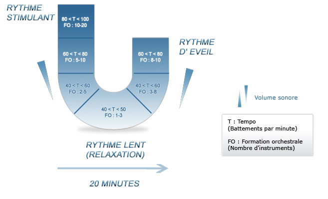 Comparable aux effets de la sophrologie et de la relaxation en général, cette technique est surtout utilisée dans le traitement de la douleur, de l’anxiété et de la dépression. Il est généralement recommandé de procéder à des séances de durée variable de 20 à 45 minutes et décomposées en plusieurs phases de 5 à 6 morceaux. Ces morceaux de 3 à 4 minutes chacun, fondus et enchaînés, amènent progressivement le patient à la détente. Le patient est allongé (état favorisant la décontraction musculaire), les yeux fermés, l’éclairage réglé au minimum. L’implication et la coopération du patient sont primordiales. La détente, le détournement de l’attention, la relaxation profonde, et la qualité de la relation patient-soignant sont des facteurs certains d’amélioration. La musicothérapie est indiquée pour des douleurs chroniques anciennes et non pour celles qui sont trop vives ou trop récentes (fractures, brûlures, ou rages dentaires). Elle est par ailleurs formellement contre-indiquée dans l’épilepsie musicogène et déconseillée dans les pathologies hallucinatoires. Les phases successives qui composent la séance de relaxation musicale, de par leurs variations de volume, de composition orchestrale et de tempo, nécessitent une écoute au casque. La diffusion musicale au casque est importante dans la mesure où elle sert de filtre à l’environnement sonore hospitalier, anxiogène pour le patient (alarmes, machines, décisions médicales,…). De plus, non diffusée dans ces conditions, elle peut être source de stress pour les autres patients ou l’équipe médicale.